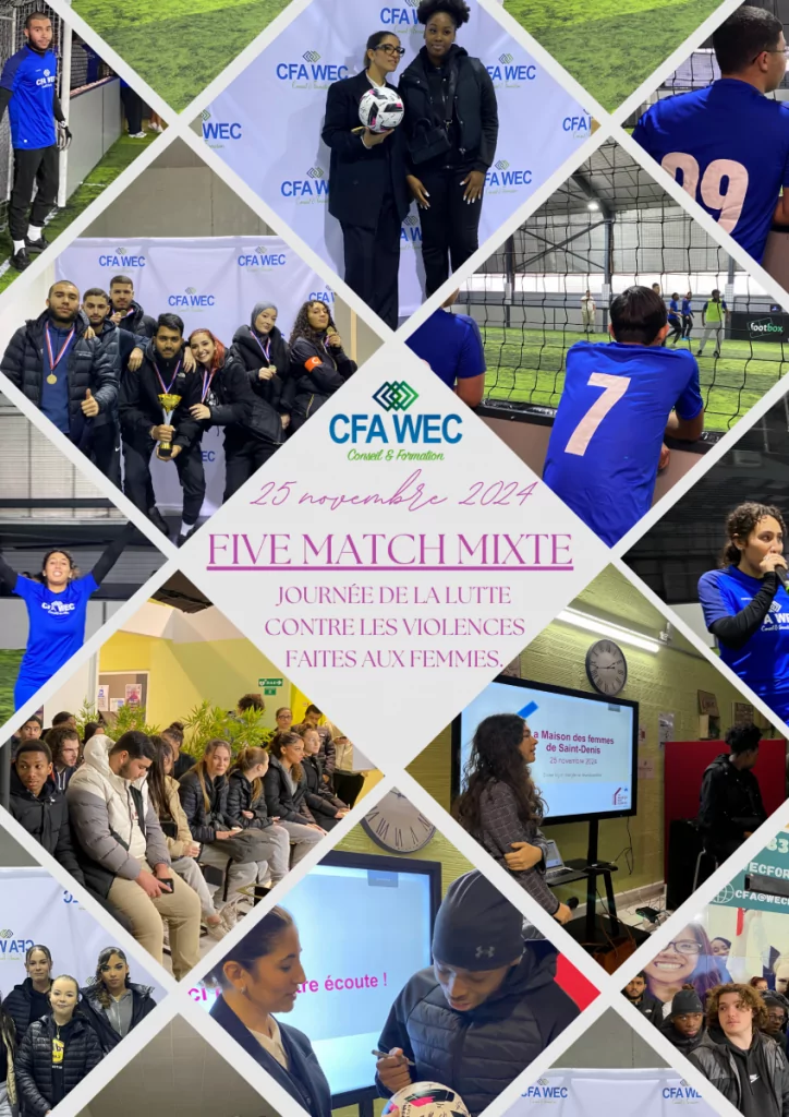 Le 25 novembre 2024, le CFA WEC organisera la deuxième édition de son Tournoi Mixte, une journée entièrement dédiée à la sensibilisation contre les violences faites aux femmes et à la promotion de l’égalité. Coïncidant avec la Journée internationale de lutte contre les violences faites aux femmes, cet événement réunira sport et engagement social dans un cadre convivial et interactif, avec une participation obligatoire pour tous les étudiants. De 9h à 18h, le CFA WEC et le Stade Five accueilleront ce rassemblement qui met l’accent sur la solidarité, le respect, et la lutte pour l’égalité.